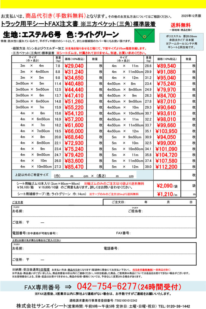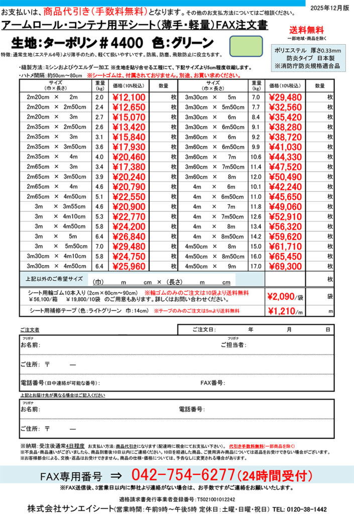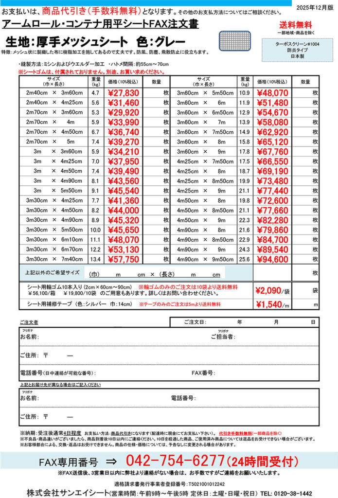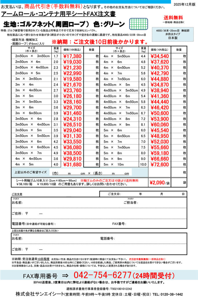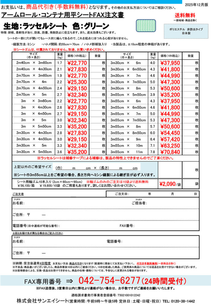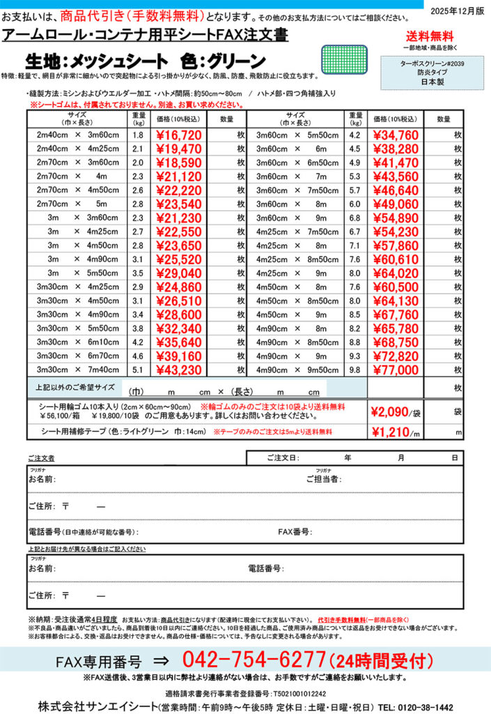この度、原材料の高騰、運送費用等の上昇や諸経費の値上がりにより、2025年12月1日より一部の商品の価格を改定させていただくことになりました。何卒、ご理解ご了承いただけますようお願い申し上げます。 1【トラック用平シート】エステル6号 色:ライトグリーン 2【アームロール・コンテナ用平シート】エステル6号 色:ライトグリーン 3【アームロール・コンテナ用平シート】ターポリン#4400 色:グリーン 4【アームロール・コンテナ用平シート】厚手メッシュシート 色:グレー 5【アームロール・コンテナ用平シート】メッシュシート 色:グリーン 6【アームロール・コンテナ用平シート】ラッセルシート 色:グリーン 7【アームロール・コンテナ用平シート】ゴルフネット(周囲ロープ) 色:グリーン 8【価格変更後の価格】シートゴム お問い合わせはフリーダイヤル (携帯電話.PHSからもご利用可能) TEL:0120-38-1442FAX:042-754-6277(24時間受付)