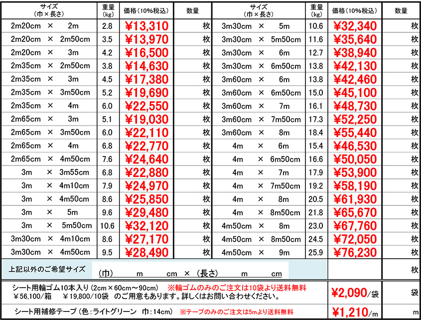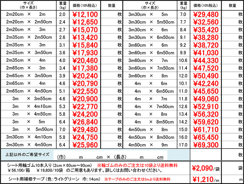 ※上記の生地以外(カラー、耐候性、軽量生地等)も取り扱っております。価格につきましてはお問い合わせください。